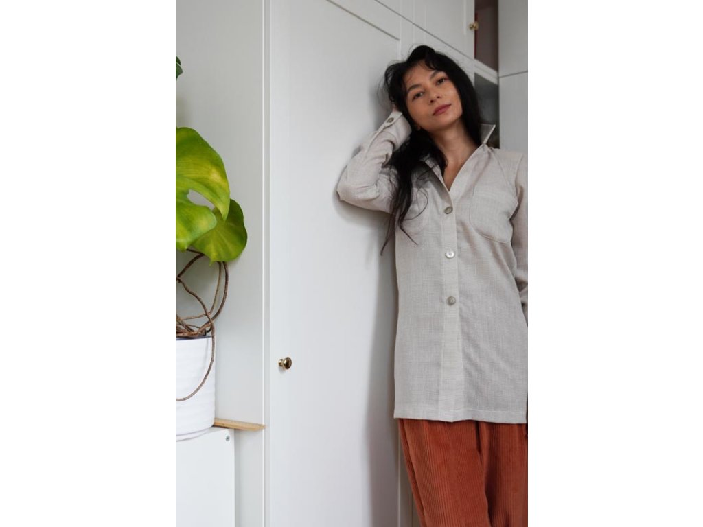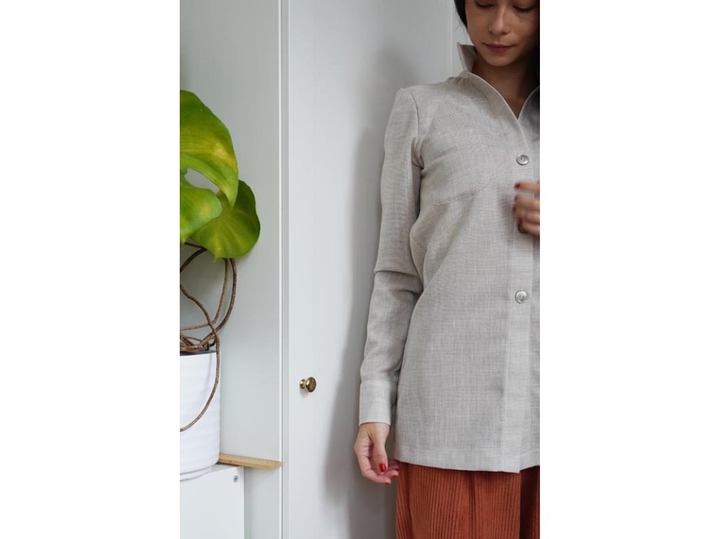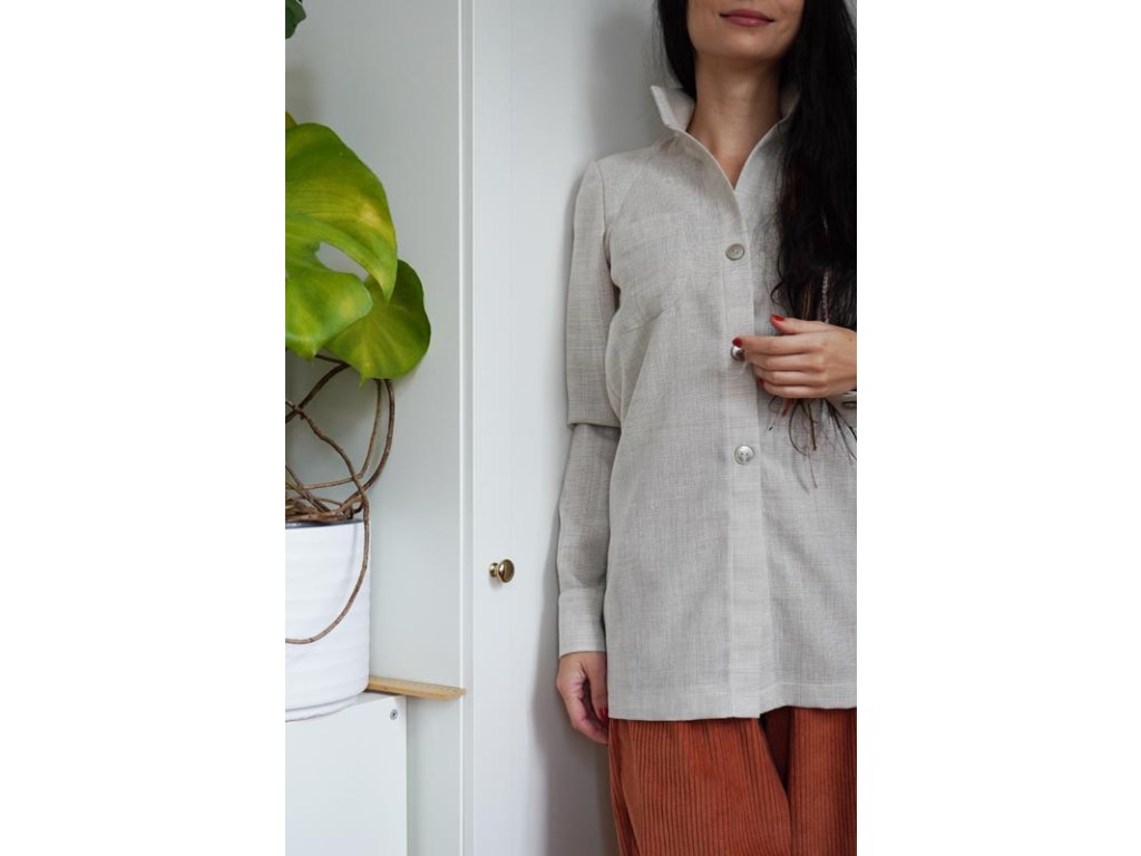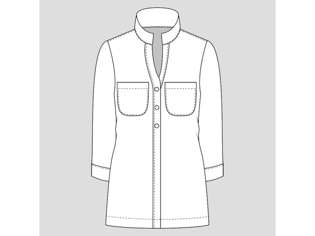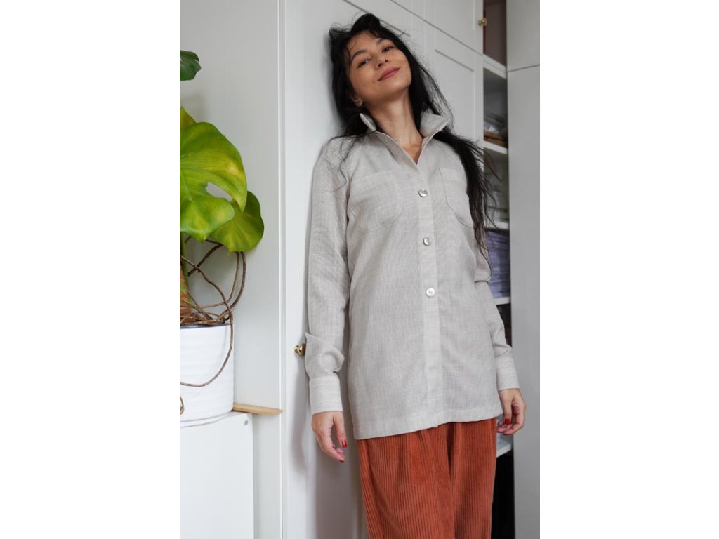 Košile je rovné, jen mírně projmuté siluety, zadní díl je členěný do tří spodních částí a dvojitého sedla. Rukávy jsou spíše užší a zakončené manžetou. Přední díly jsou doplněny kulatými nakládanými kapsami. Košile je delší, díky tomu a také díky velmi univerzálnímu střihu se hodí k ušití z mnoha materiálů. Pokaždé vám vznikne trochu jiný a neotřelý avšak nadčasový model. Ostatně, podívejte se na následující fotky sami...