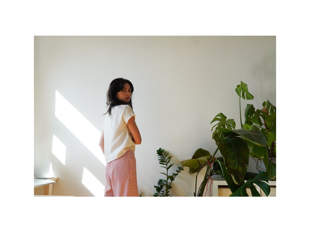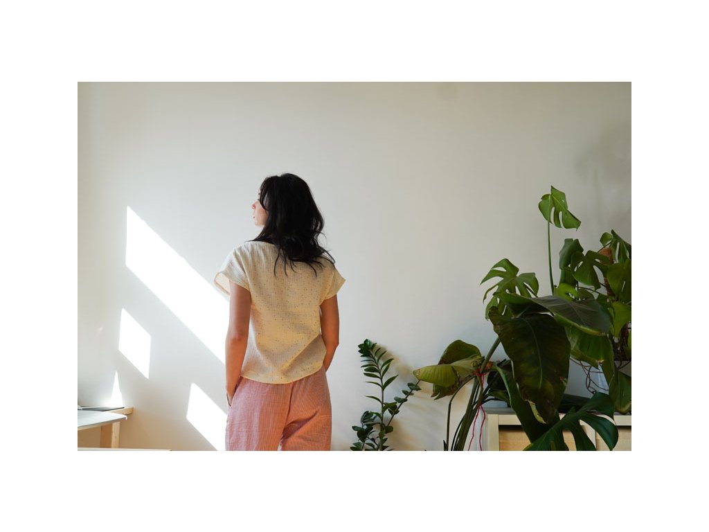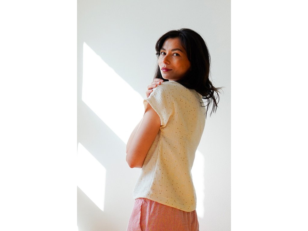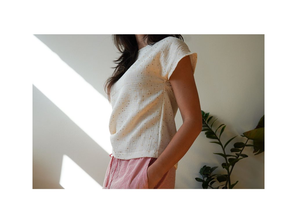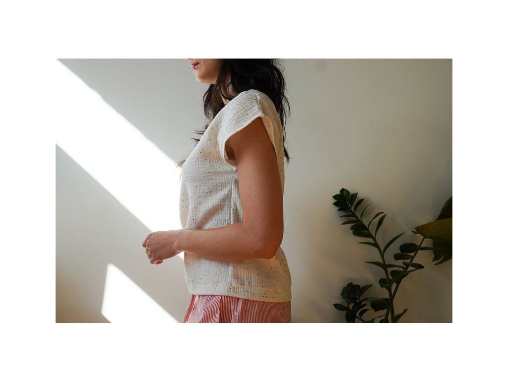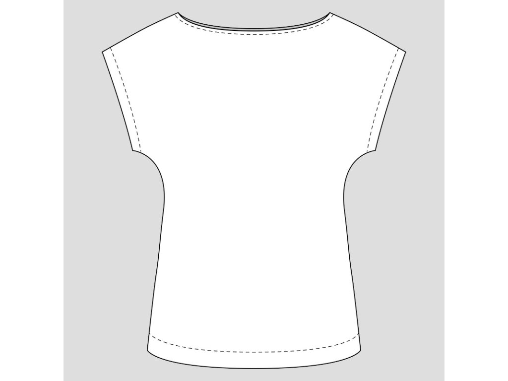 Střih na dámské tričko je vhodný pro slabší až středně silné tkaniny, jako je bavlněný popelín, bavlněný mušelín, viskózová halenkovina apod.